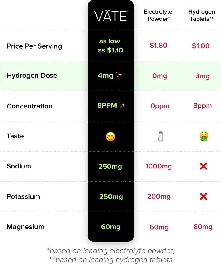 Regular electrolytes are shockingly ineffective. They don't hydrate at the cellular level so they're just sweated out with no lasting benefits. But VÄTE™ infuses balanced electrolytes with molecular hydrogen to hydrate you deep at a cellular level unlocking unparalleled lasting performance.
